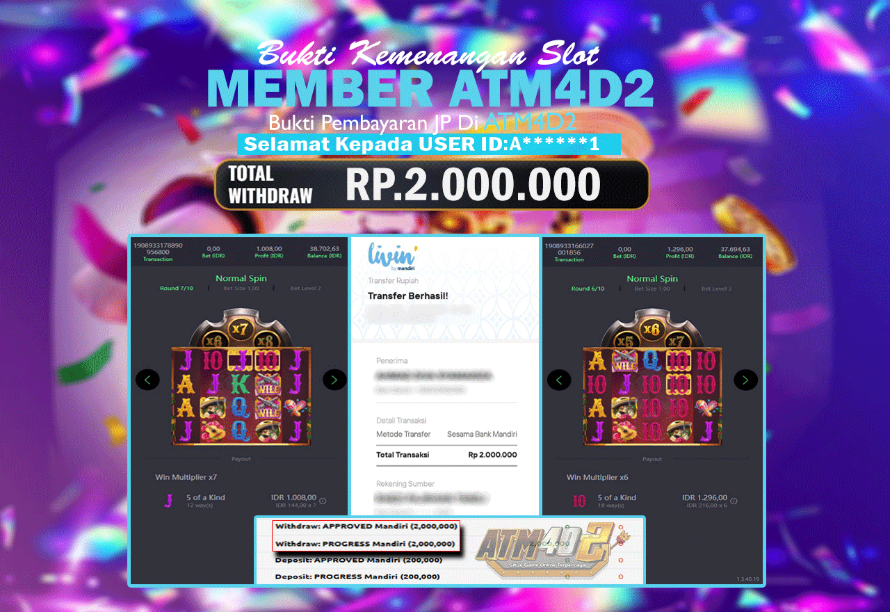 ATM4D2 dikenal sebagai situs terpercaya yang selalu menghadirkan pengalaman bermain slot online yang aman, fair, dan berlisensi resmi. Di sini, kami tidak hanya sekadar memberikan janji, tapi bukti nyata berupa slip kemenangan yang dapat Anda lihat secara langsung.