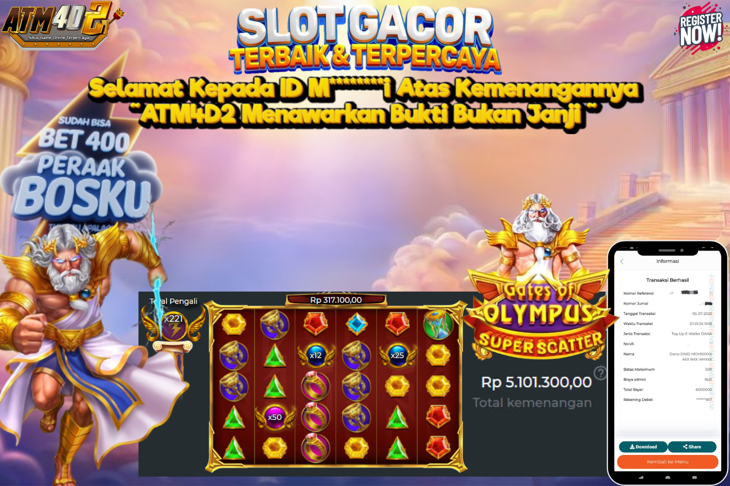 ATM4D2 dikenal sebagai situs terpercaya yang selalu menghadirkan pengalaman bermain slot online yang aman, fair, dan berlisensi resmi. Di sini, kami tidak hanya sekadar memberikan janji, tapi bukti nyata berupa slip kemenangan yang dapat Anda lihat secara langsung.