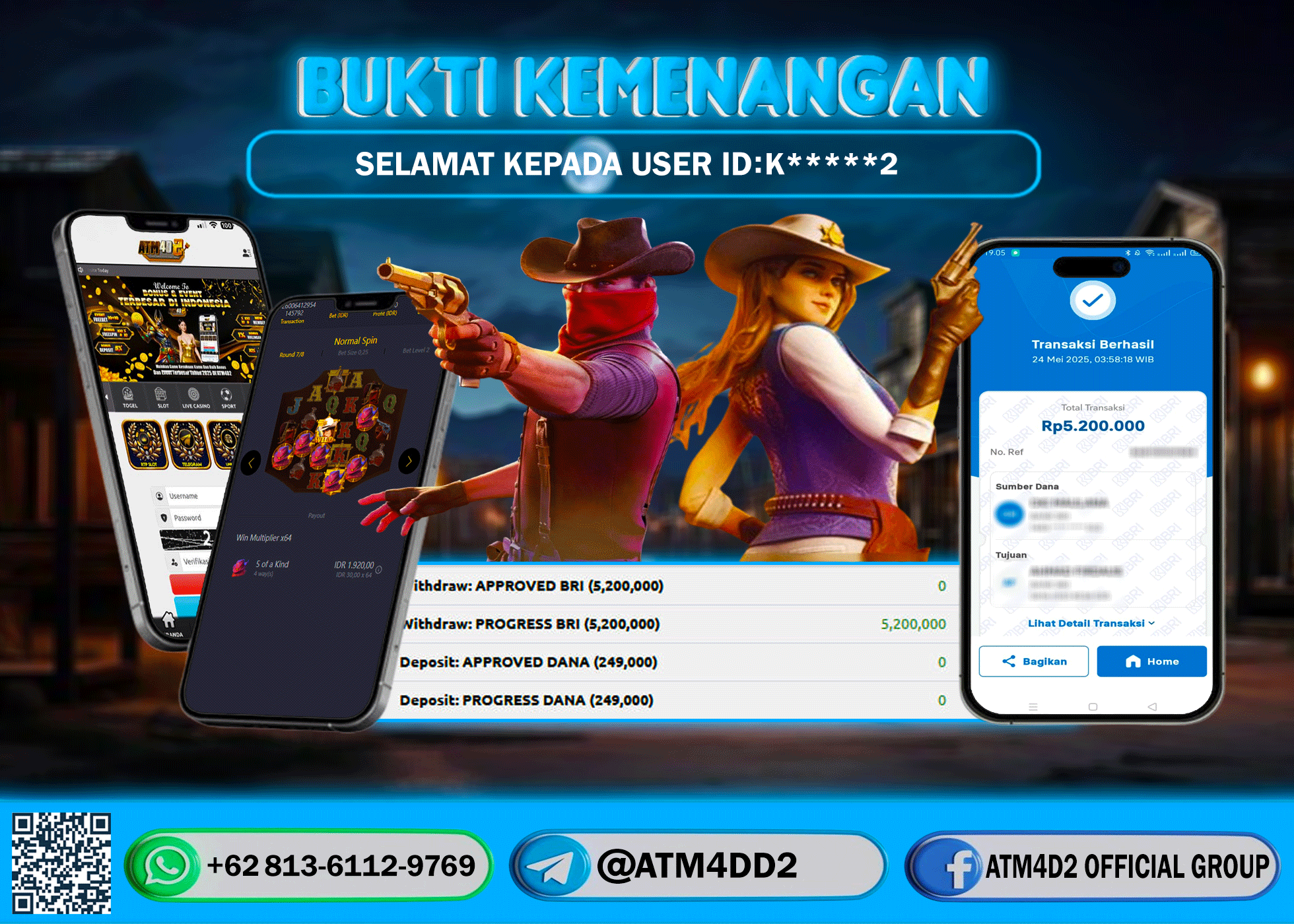 ATM4D2 dikenal sebagai situs terpercaya yang selalu menghadirkan pengalaman bermain slot online yang aman, fair, dan berlisensi resmi. Di sini, kami tidak hanya sekadar memberikan janji, tapi bukti nyata berupa slip kemenangan yang dapat Anda lihat secara langsung.